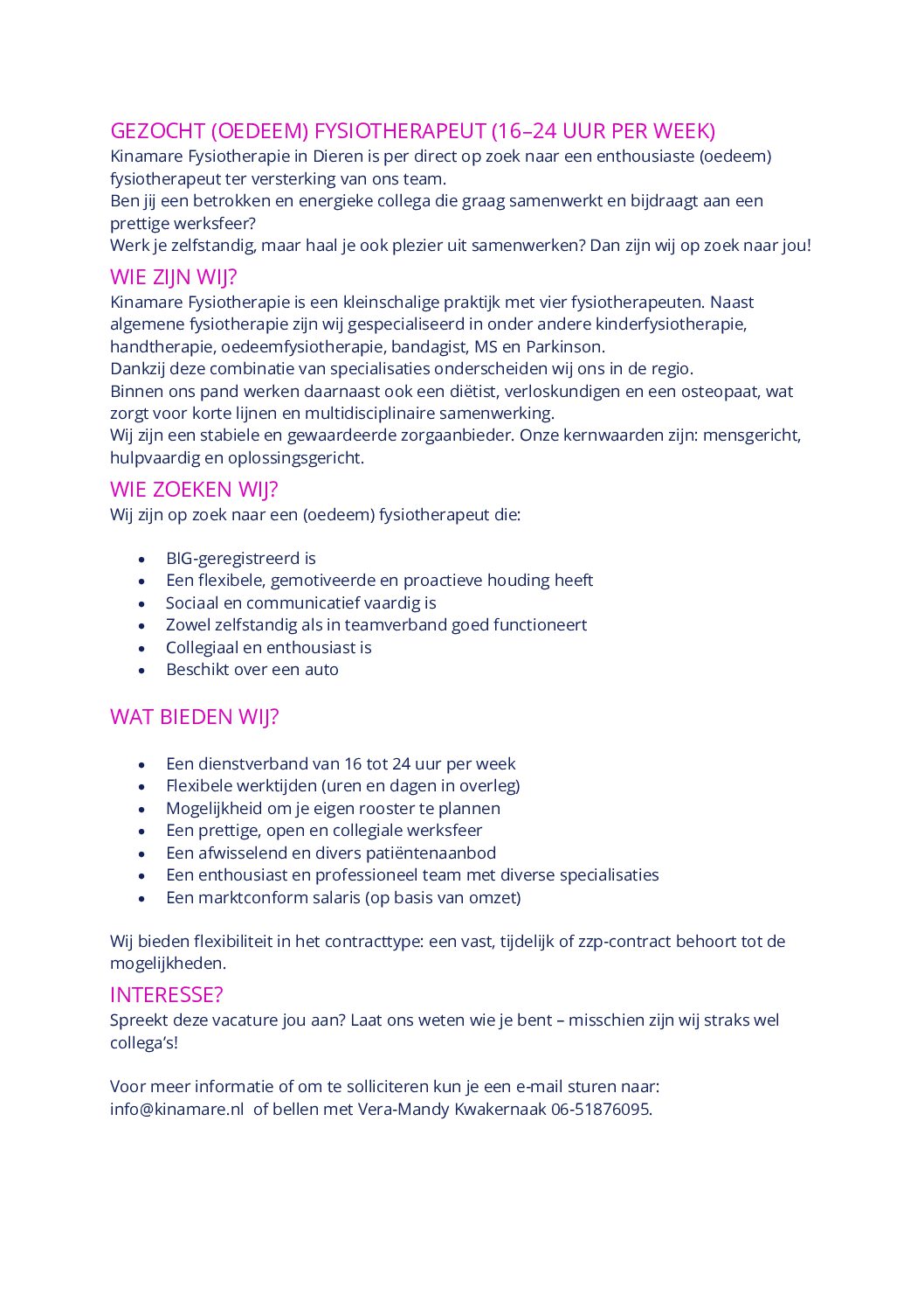 Een behandeling neemt ongeveer een halfuur per keer in beslag. Dit kan zijn oefentherapie, medical taping, dry needling, lymfedrainage, houding- en beweegadviezen, etc. Bent u niet in staat om naar de behandellocatie te komen, dan komt de fysiotherapeut bij u thuis. Dit gebeurt overigens alleen in overleg met de arts.